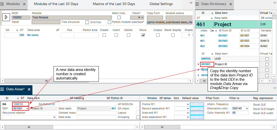 - Copy the ID number of the Project ID data item to the DDI data field in the Data Areas module by using Drag&Drop copy.