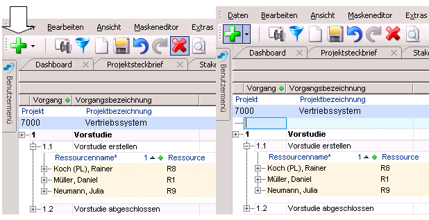 Insertion by Clicking on the Plus-Symbol in the Data Area Caption Line