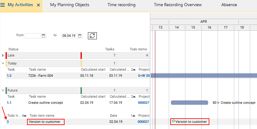 - In the My Activities module, the project team member can see in which projects she is planned in and which tasks and items are to be carried out.