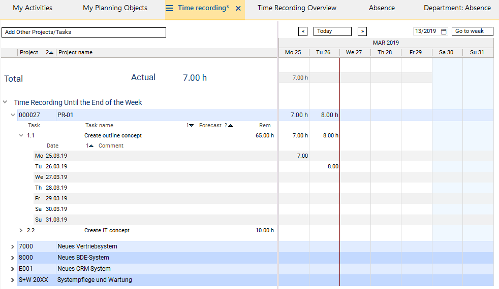 - In the left window, the projects and tasks are listed that the application development department or individual employees of the department are assigned to as resources.