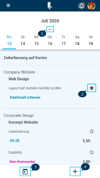• Zeiterfassungsfavoriten werden immer oben angezeigt und bleiben auch über die aktuelle Woche hinaus stehen.