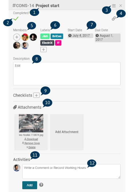 - In the detail view of the card in the area Attachments, there are links to download or delete the files or to add/remove them as cover. Further attachments can be added as well.