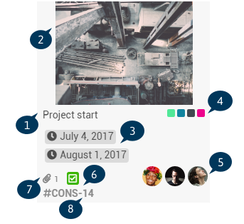 - On cards with links to boards, the symbol 2/5 indicates how many cards of the board have already been completed.