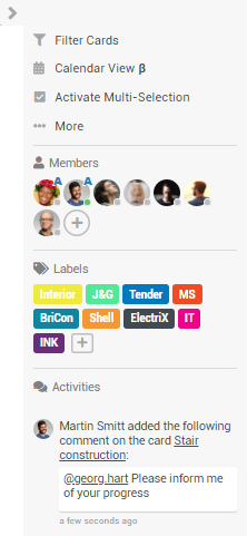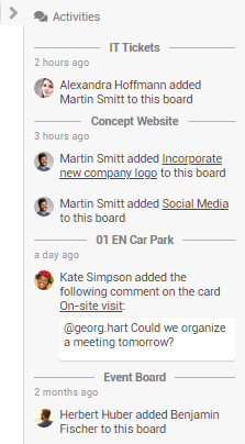 - In the panel Boards, the sidebar offers an overview of the activities on all boards of the user.