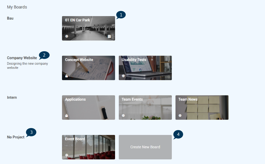 • Boards which don’t belong to a project are displayed in the category No Project.