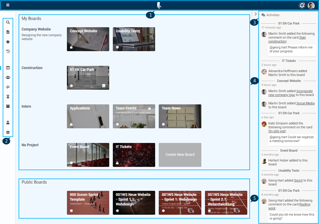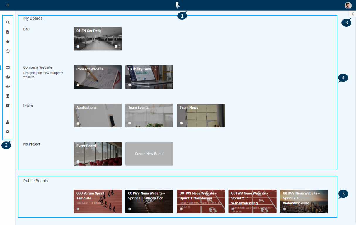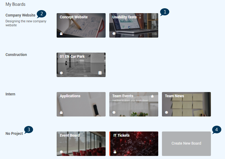 • In the panel Boards, all boards of which the currently logged-in user is a member and all public boards are displayed as board cards and sorted by projects.