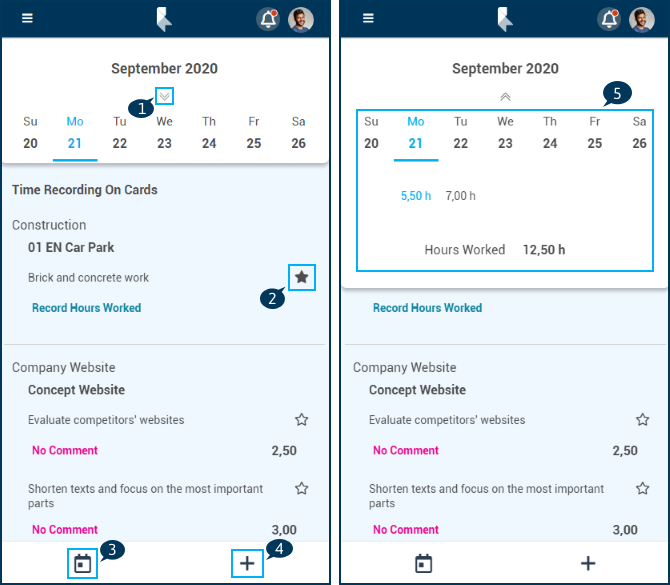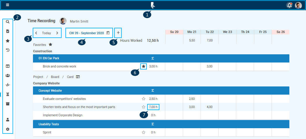 - Weekly overview with the recorded hours worked of the selected week (5)