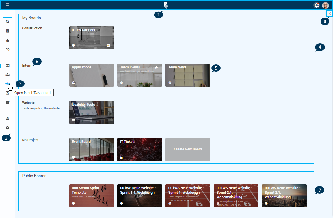 • Via the arrow (8), the sidebar can be opened. Here, the newest activities on the user’s boards are shown.