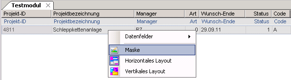 - Hat der zu bearbeitende Datenbereich ein horizontales oder ein vertikales Layout, das Layout durch Auswahl des Befehls Maske aus dem Kontextmenü oder über den Menüpunkt Maskeneditor Maske auf Maske ändern.