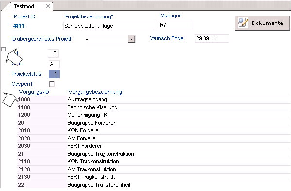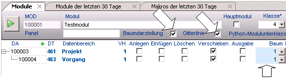 - Im Modul Testmodul die Vorgänge des Projekts als Baumstruktur anzeigen lassen