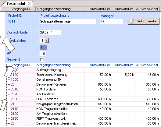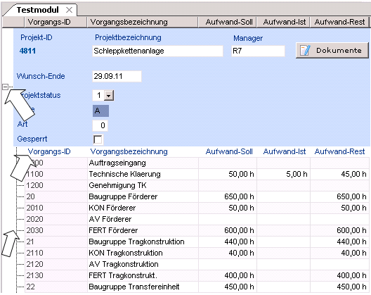 - Zusätzlich erscheint im Projekt-Datenbereich das +/- -Symbol, mit dem die Vorgänge ein- bzw. ausgeblendet werden können.