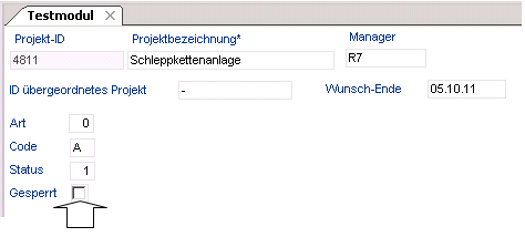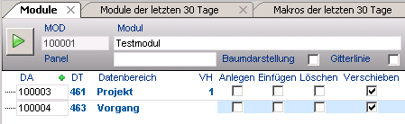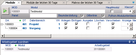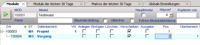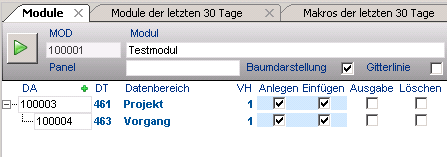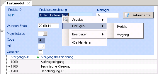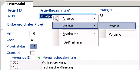 - Im Modul Testmodul für die Datenbereiche Projekt und Vorgang das Einfügen ermöglichen