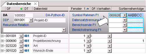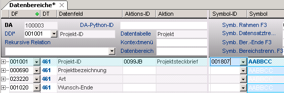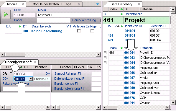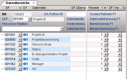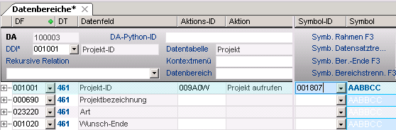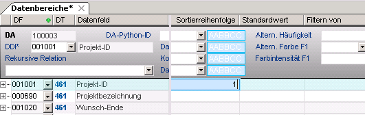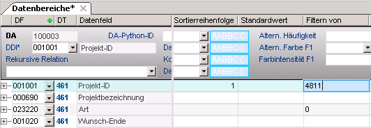 - Mit Drag&Drop-Kopieren die Identnummer des Dataitems Projekt-ID auf das Datenfeld DDI im Modul Datenbereiche kopieren oder diese manuell eintragen.