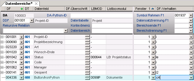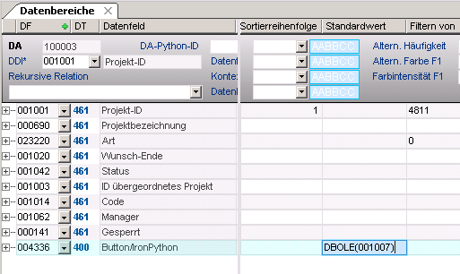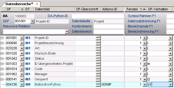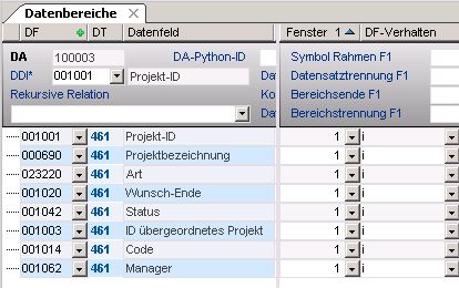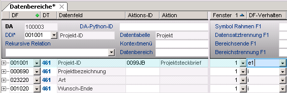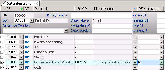 - Das Datenfeld Projekt-ID aktivieren und über die rechte Maustaste oder durch Klick auf den Button Einfügen in der Symbolleiste weitere Datenfelder einfügen.