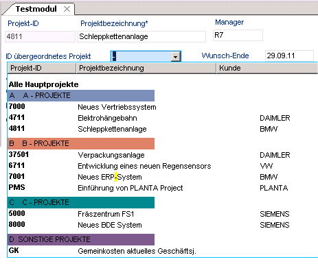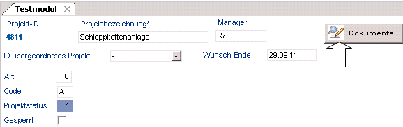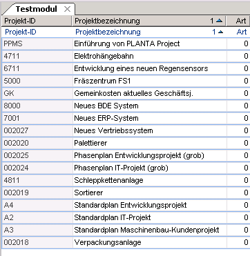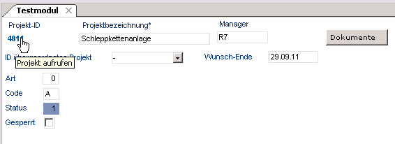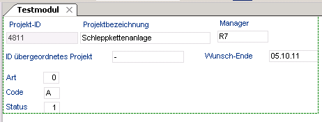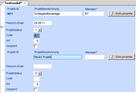 - Das Panel mit dem Hauptmodul Testmodul und dem Untermodul Projekte wird aufgerufen.