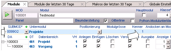 - Im Feld SUBMOD die ID des Moduls eingeben, das als Untermodul in das Panel eingefügt werden soll, z.B. das Modul 0099G2 Projekte.