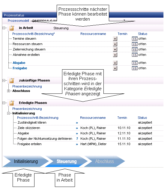 Die erledigte Phase mit ihren Prozessschritten wird in die Kategorie Erledigte Phasen verschoben.